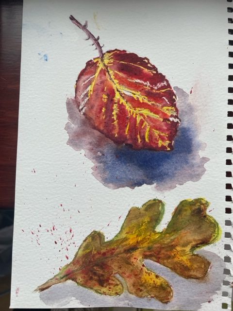 This week we experimented with ‘wet-in wet’ and ‘wet on dry’ watercolour painting techniques and used ‘resist’ techniques for painting Autumn leave. These are our results. I think they are so beautiful!