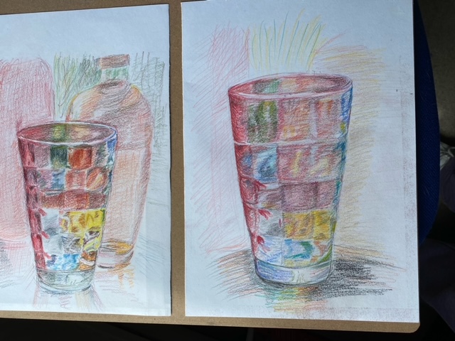 These beautiful drawings of the glasses were produced by my students at the online Fundamental Art Skills course level 2. They managed to show the reflections and the shiny surface of glass so well using a variety of different tones and coloured pencils. You can almost feel the fragile glass they are made of. Fantastic achievement by my hard -working learners.