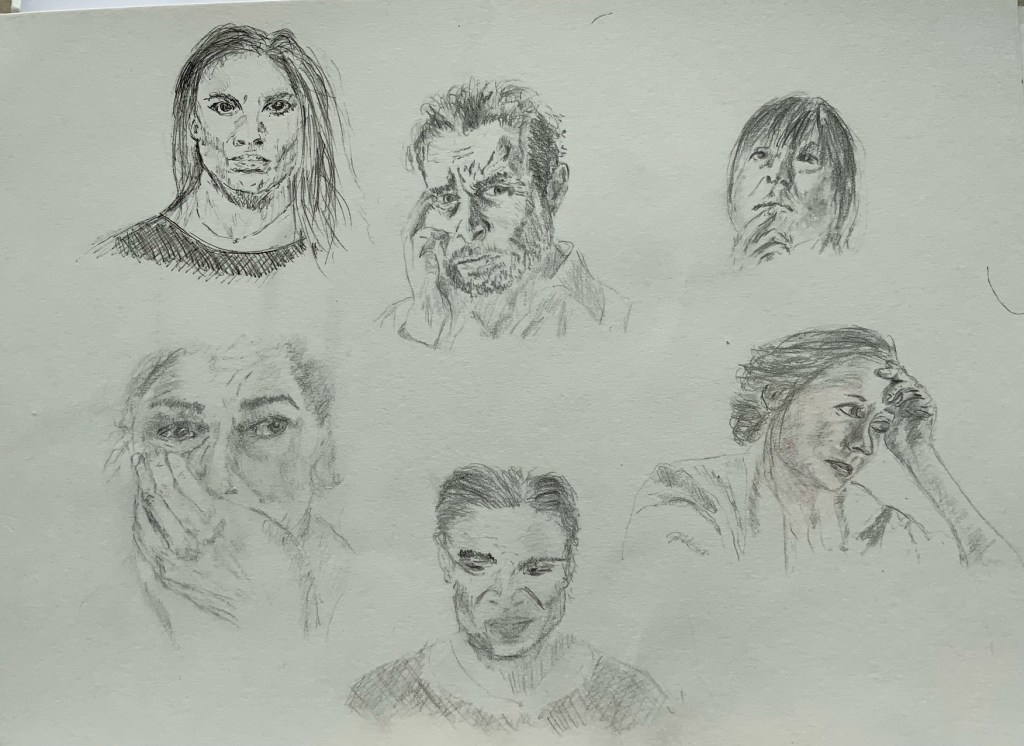 Upper Intermediate online Portrait course is going really well. These are the earlier drawings that my students did when we were studying emotions. It was a fun subject, and we looked at how facial expressions changed depending on emotions. We also learnt about expressive gestures. These studies are done with various materials, and some of them are quite sketchy, however, each study captures a particular emotion really well. I really enjoy teaching my enthusiastic learners! Great lessons!